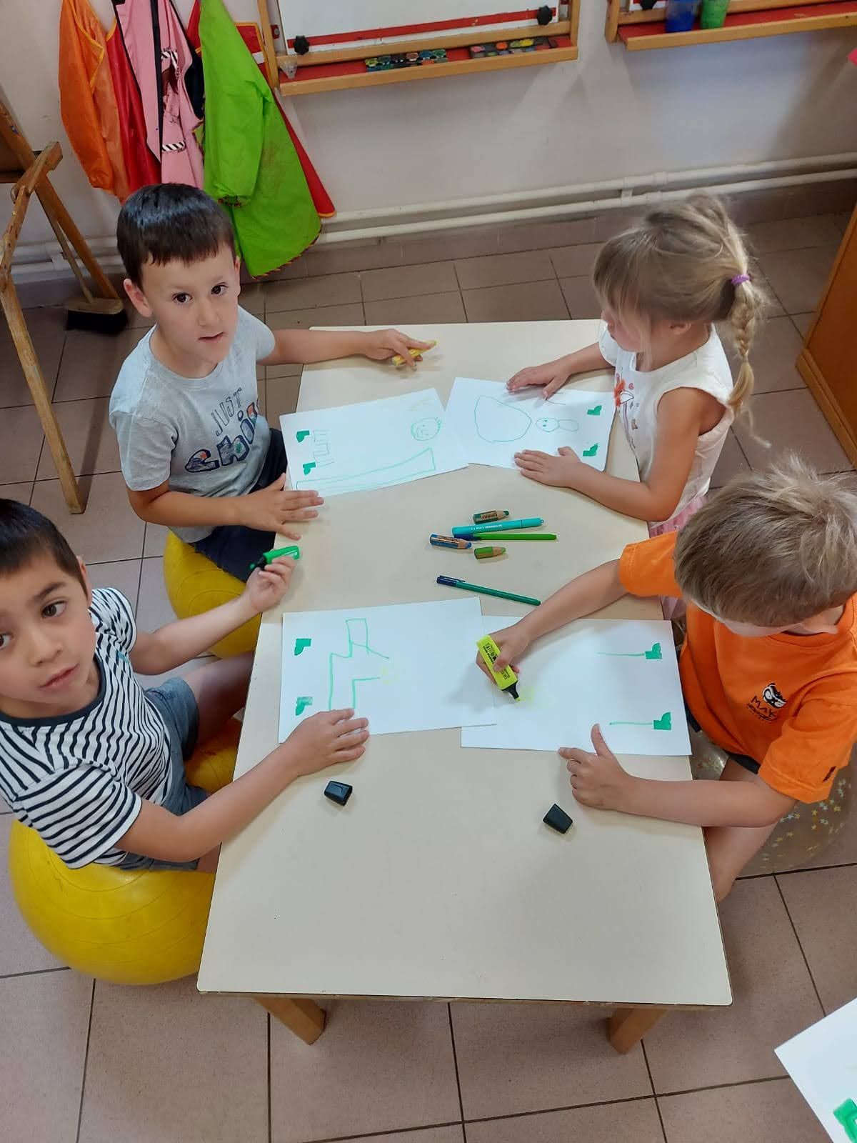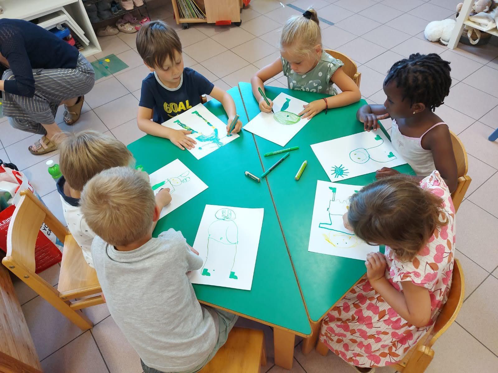– Madame Sophie nous lit l’histoire sans montrer les images. Nous imaginons et dessinons dans notre carnet.