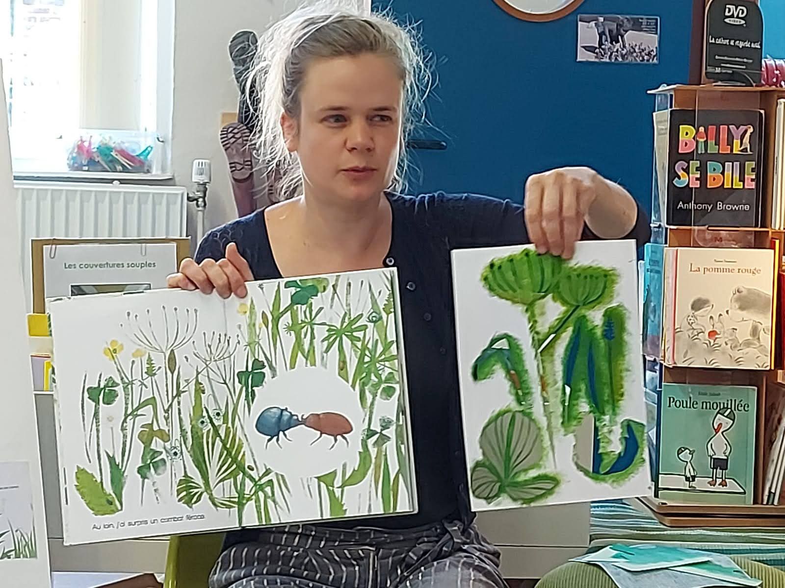 Anaïs parcourt l’album en mettant en évidence les détails de ses illustrations.