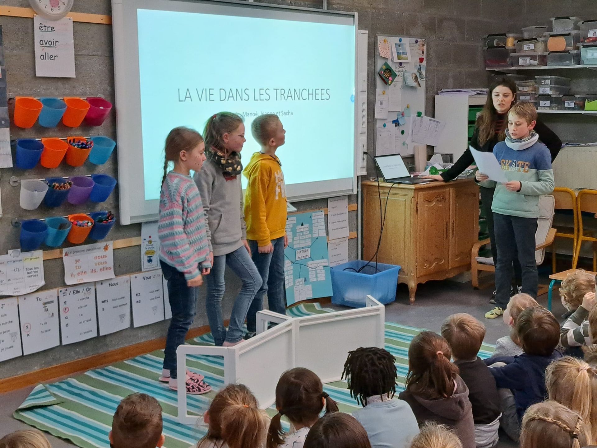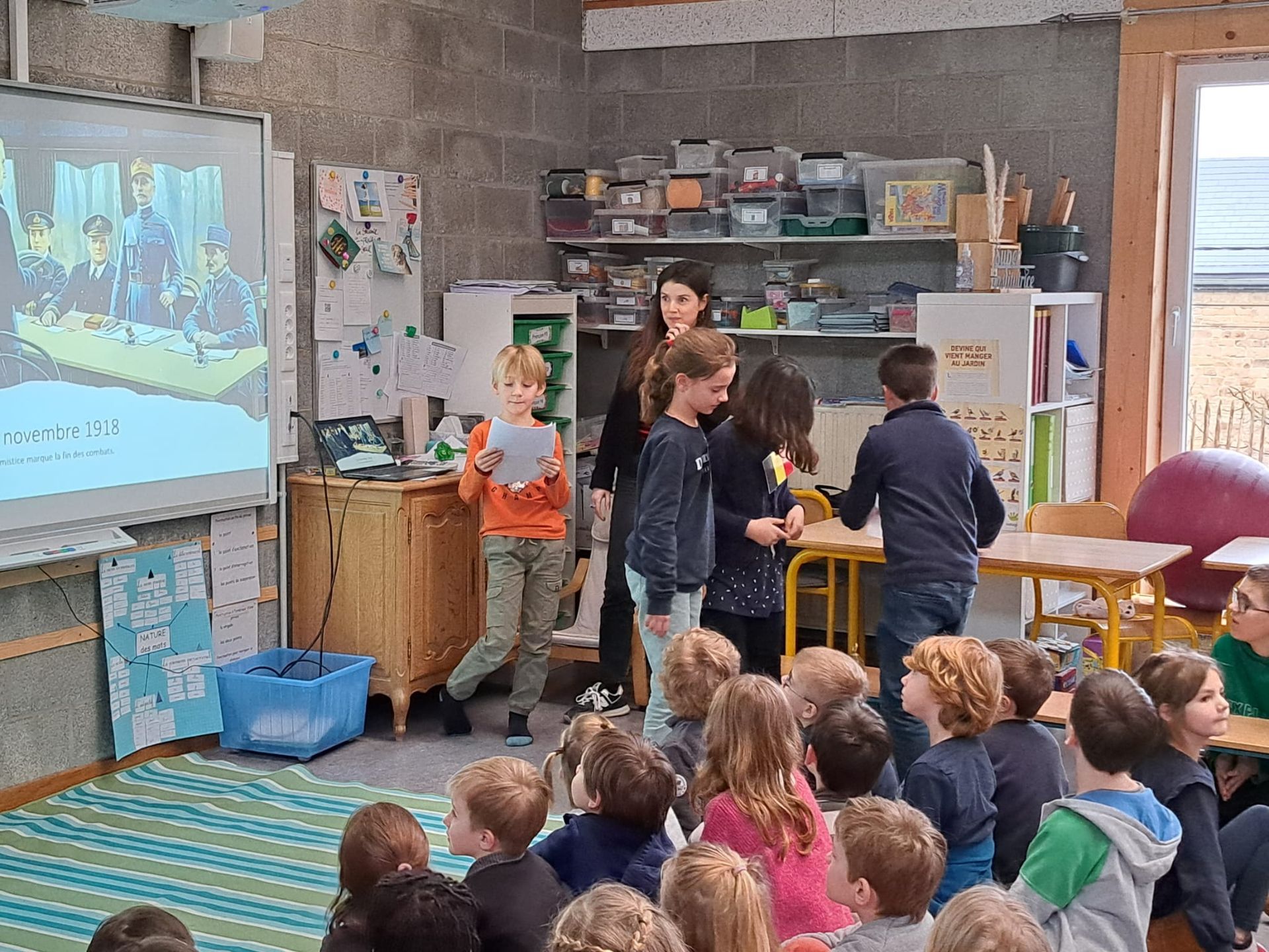 Ce jeudi 8 février 2024, les élèves de la classe de P3-4, encadrés par Madame Caroline, ont présenté une série de saynètes traitant du déroulement de la première guerre mondiale.