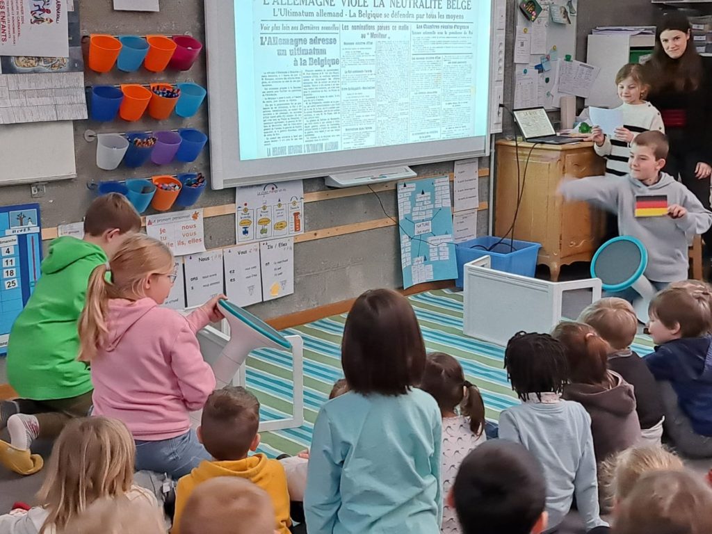 Les enfants ont en effet préparé une série de saynètes historiques qui leur ont permis de présenter à leurs invités du jour, à savoir les élèves des classes de M3, P1-2 et P5-6, les différents événements qui se sont déroulés durant la « Grande guerre », à savoir l’assassinat à Sarajevo de l’archiduc autrichien François-Ferdinand et de son épouse le 28 juin 1914, la déclaration de guerre de l’Autriche-Hongrie à la Serbie le 28 juillet 1914 ou encore la déclaration de guerre de l’Allemagne à la Russie le 1er août 1914.