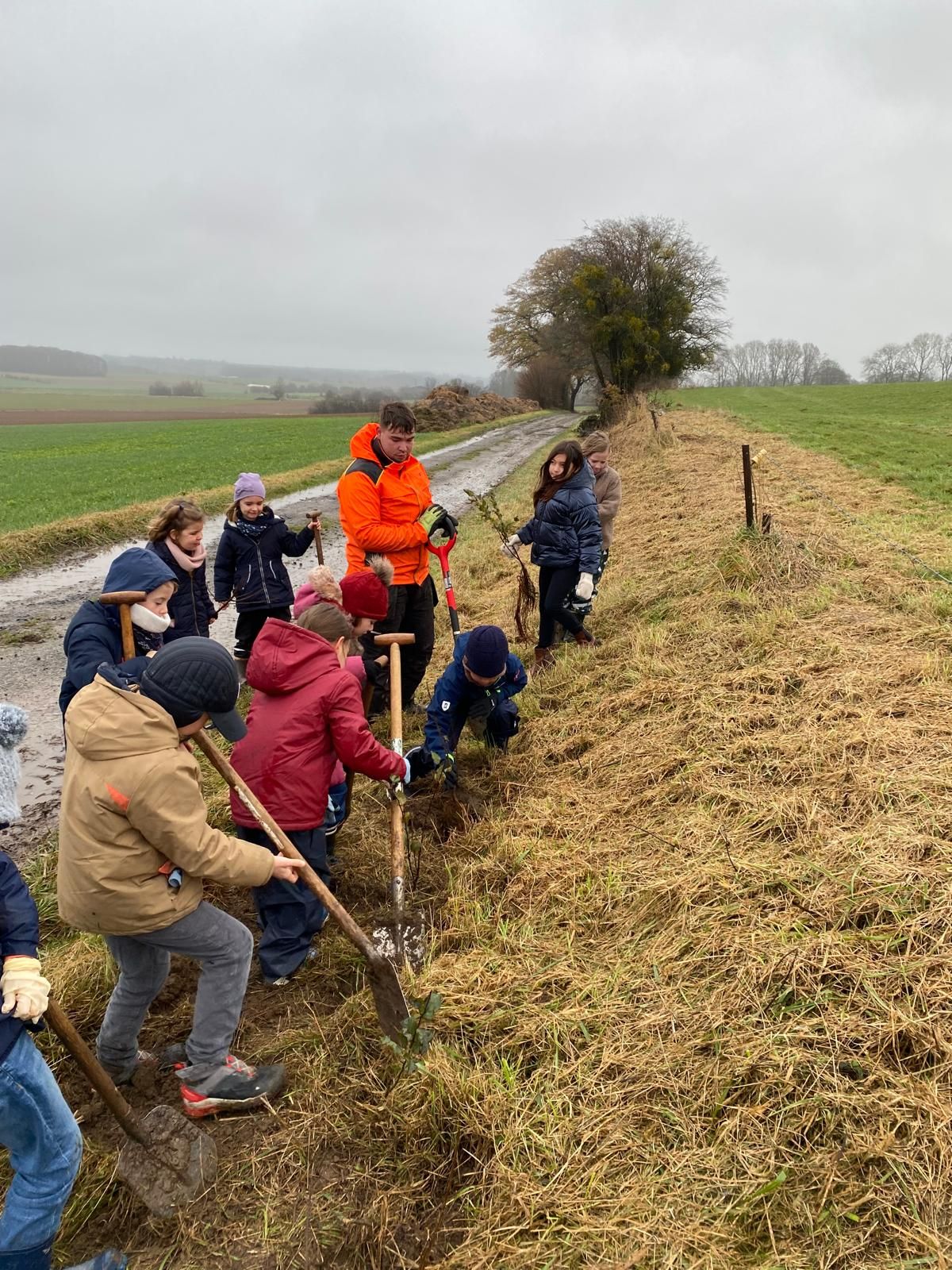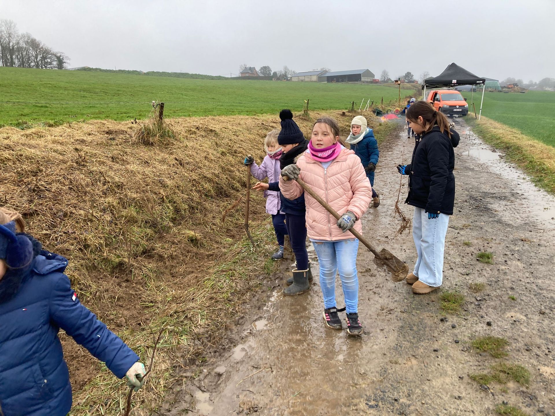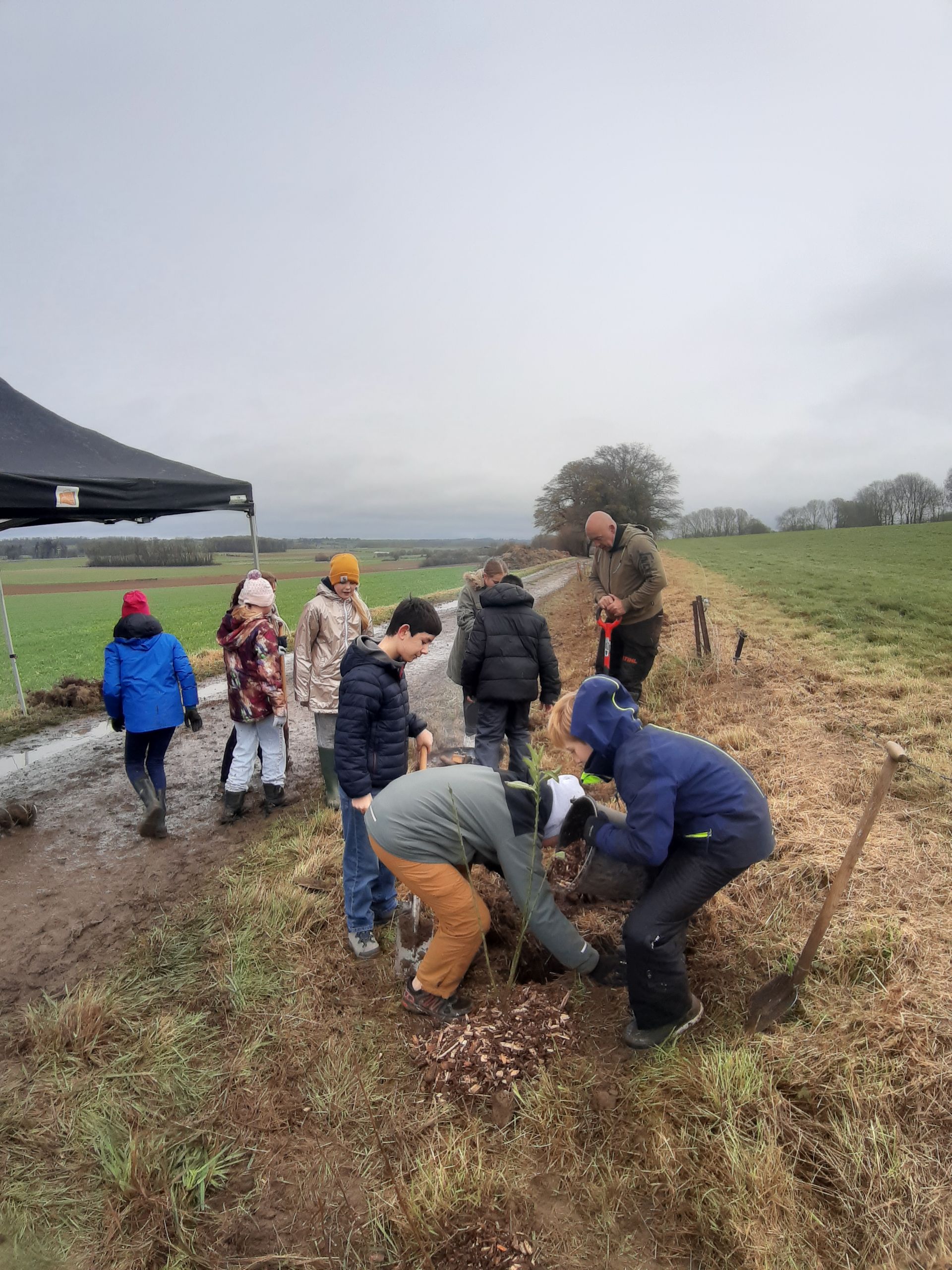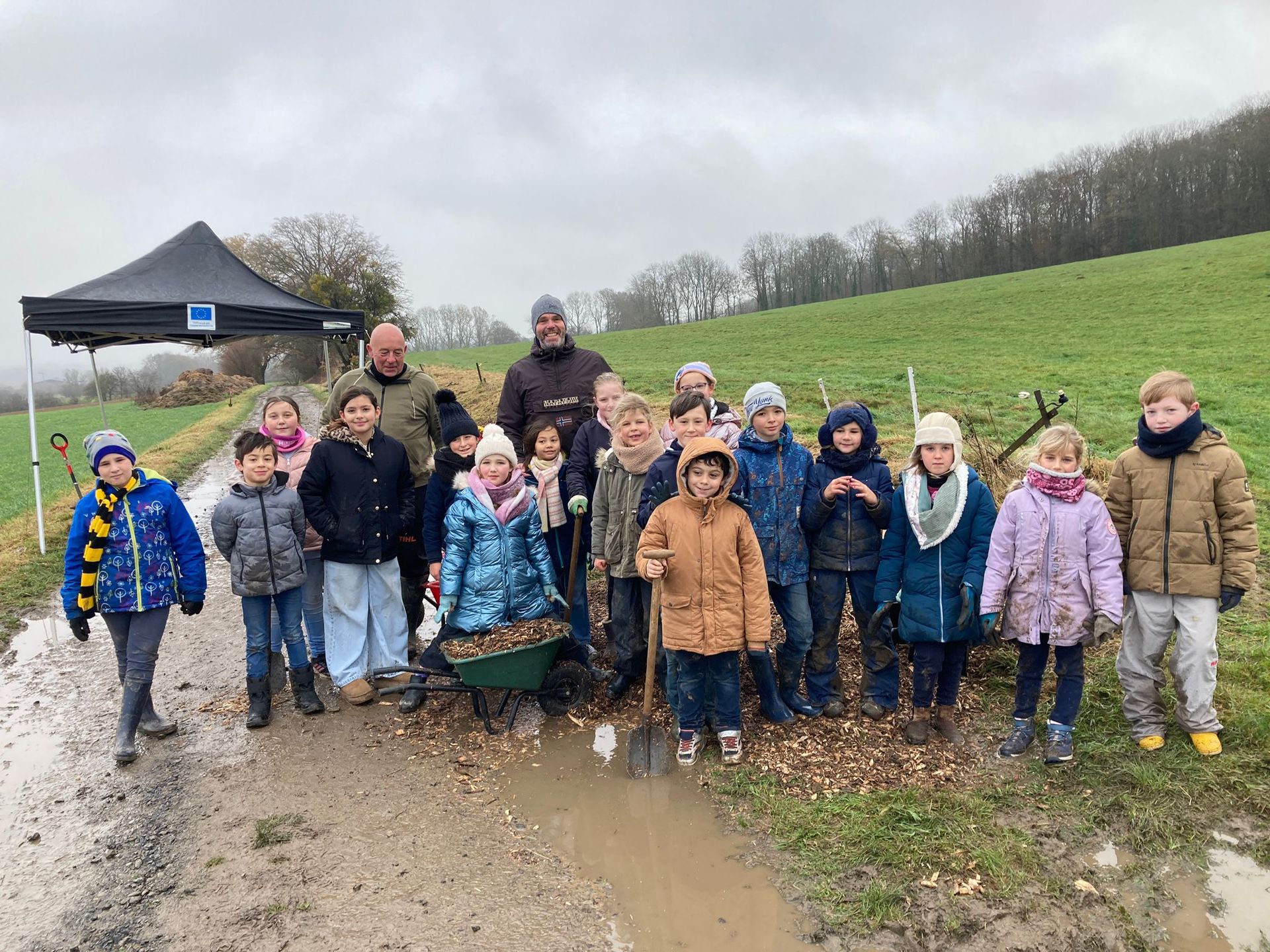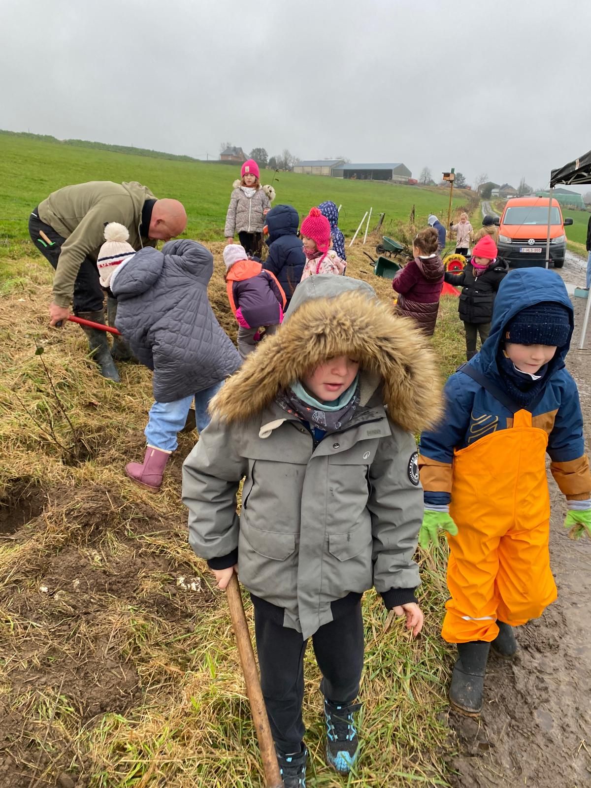 Ce vendredi 28 novembre 2025, les enfants de nos classes primaires ont retroussé leurs manches pour participer à l’opération Haie-Lève, organisée en partenariat avec le Parc naturel « Cœur du Condroz ». Aux côtés de Pierre André, dit « Pelo », véritable pilier de ce projet plusieurs années, les enfants ont poursuivi la plantation des arbustes qui finiront un jour à créer une haie vivante reliant le village de Sorée à la Bouchaille.
