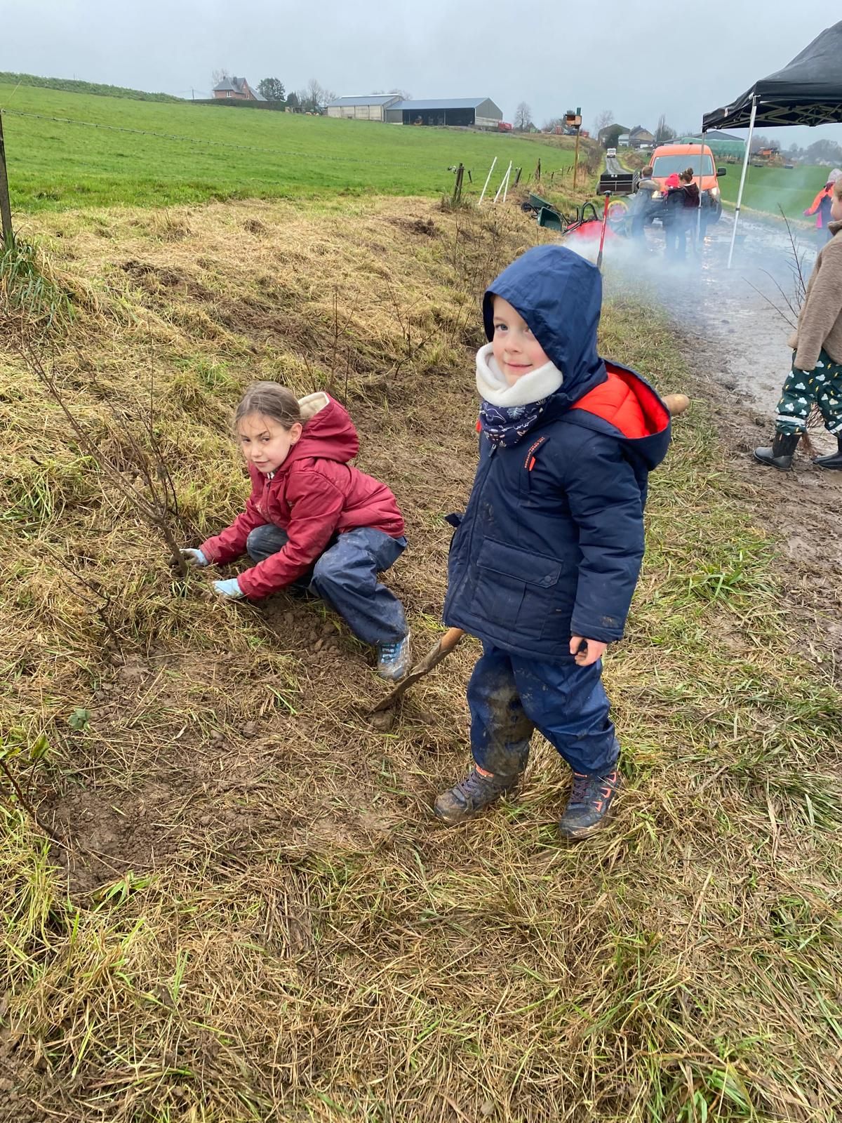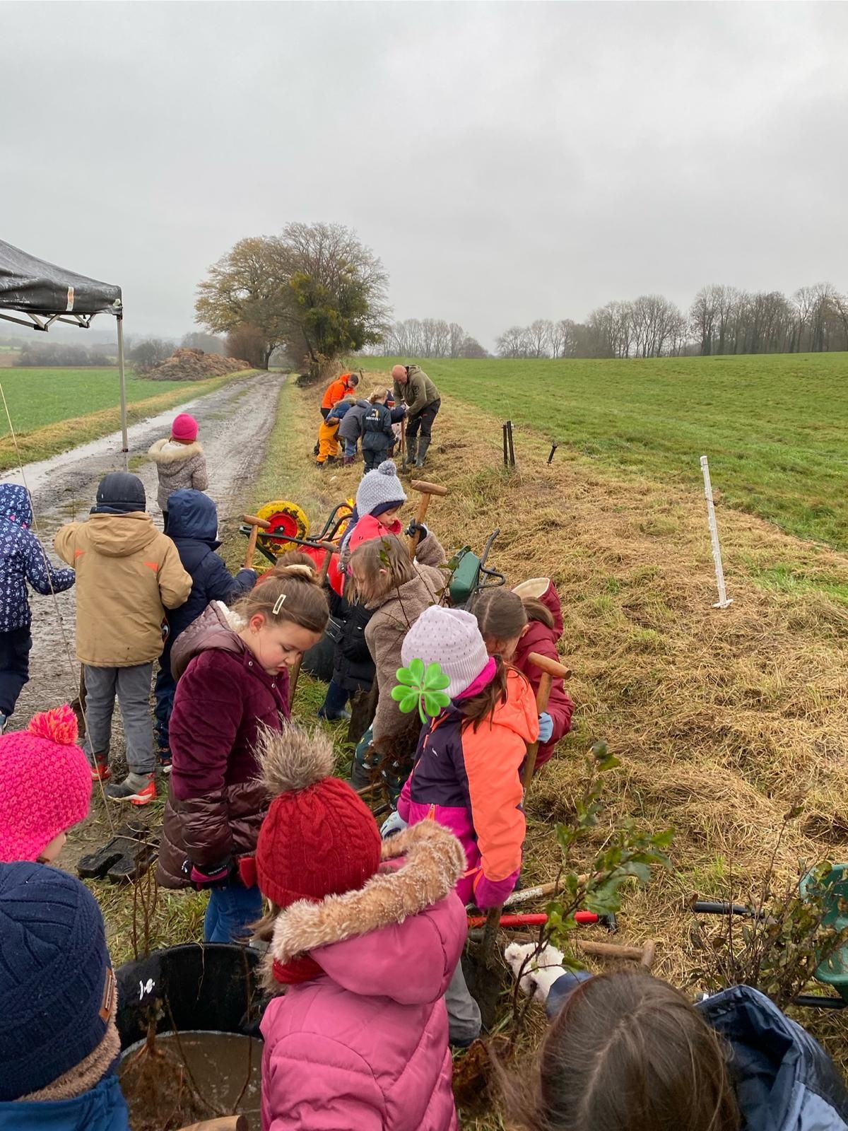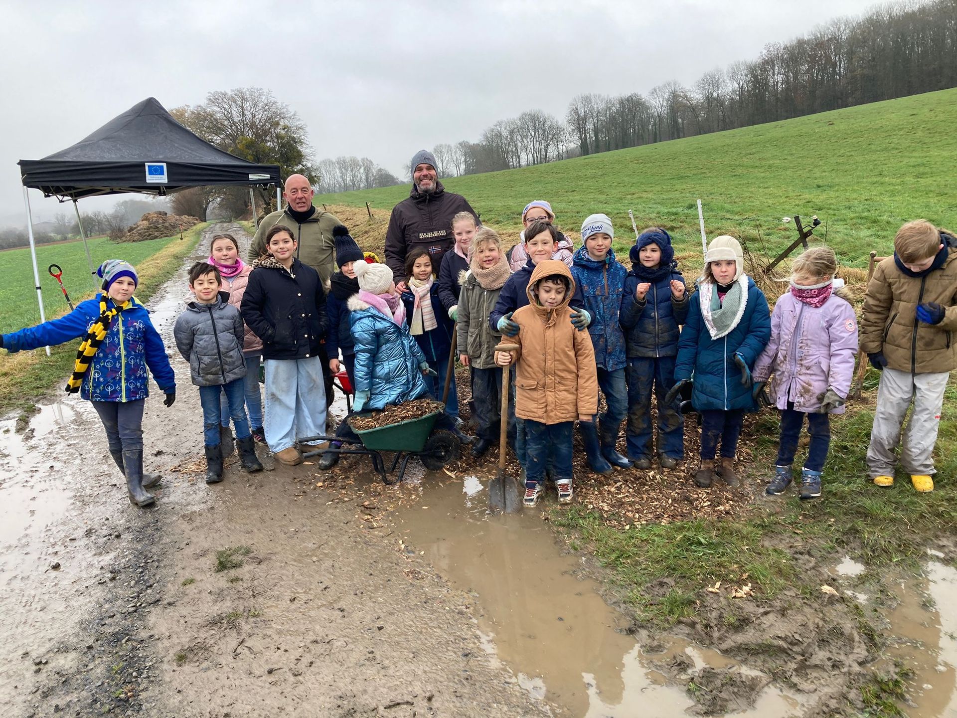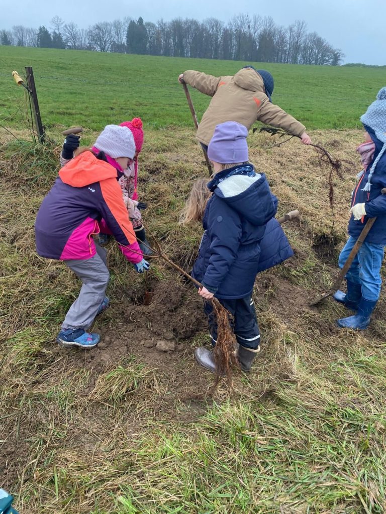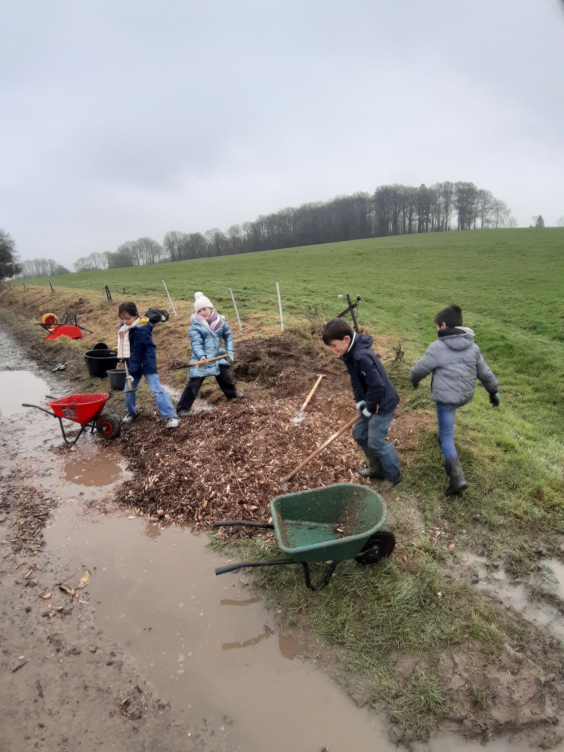 Ce vendredi 28 novembre 2025, les enfants de nos classes primaires ont retroussé leurs manches pour participer à l’opération Haie-Lève, organisée en partenariat avec le Parc naturel « Cœur du Condroz ». Aux côtés de Pierre André, dit « Pelo », véritable pilier de ce projet plusieurs années, les enfants ont poursuivi la plantation des arbustes qui finiront un jour à créer une haie vivante reliant le village de Sorée à la Bouchaille.