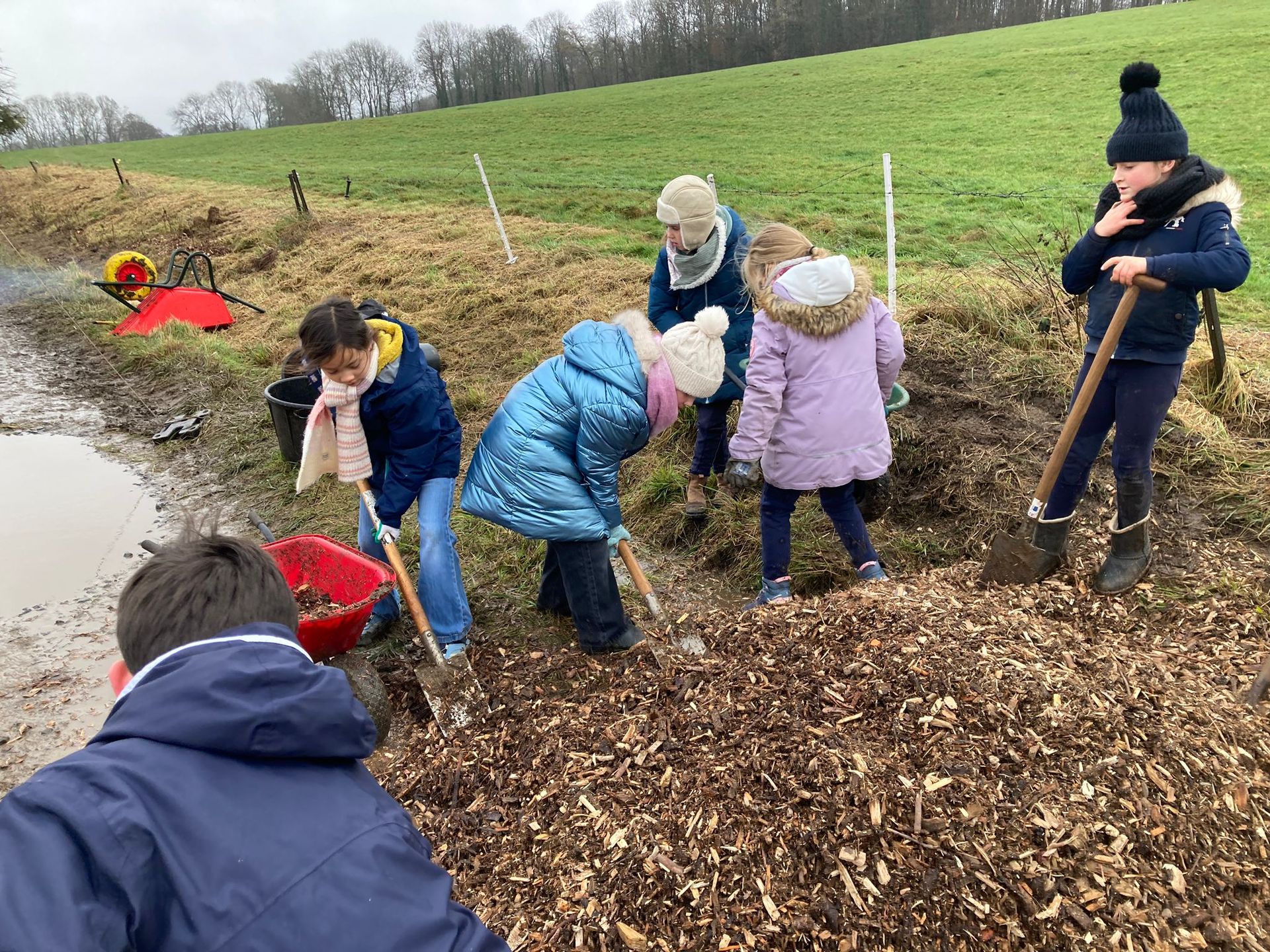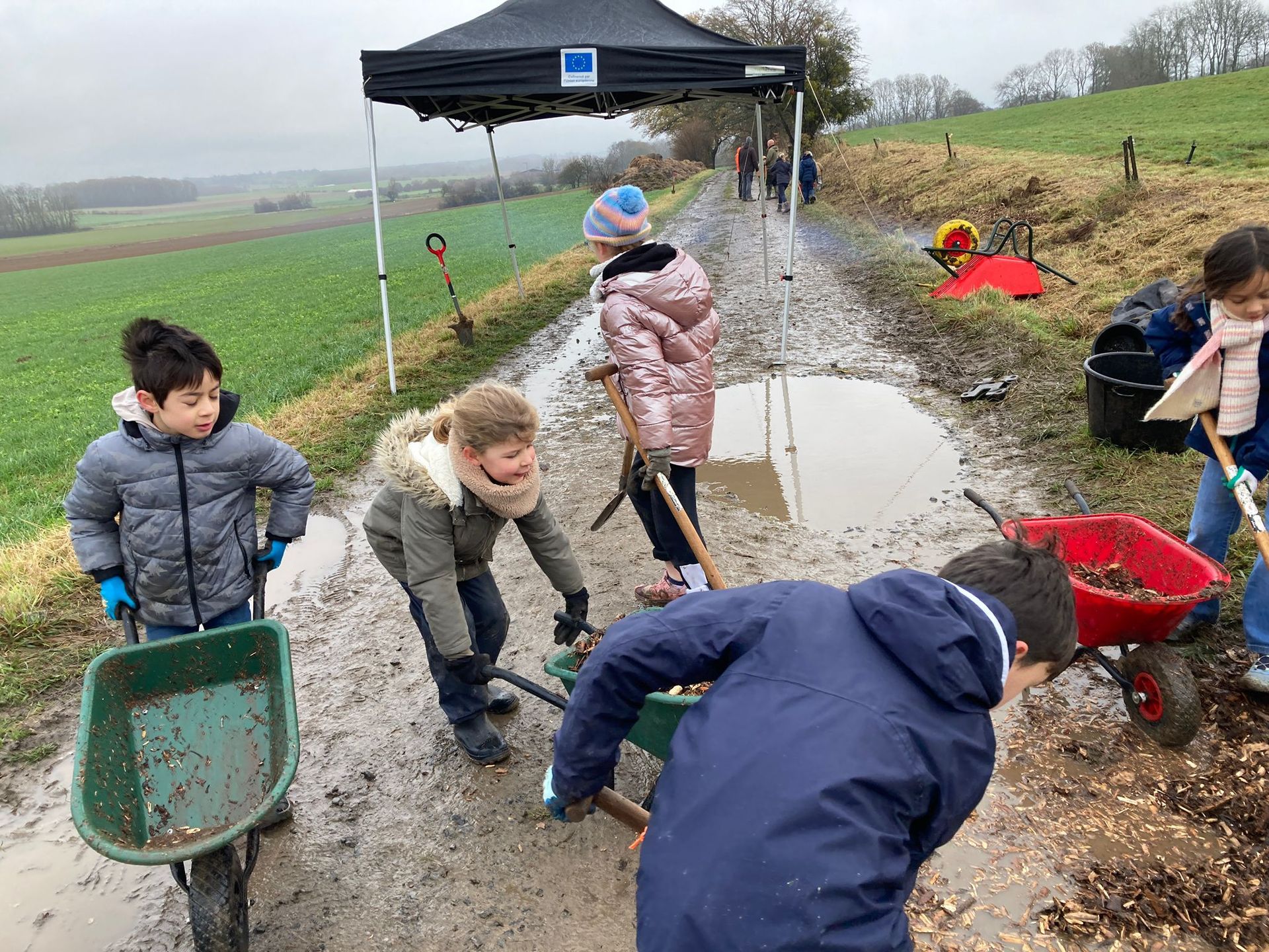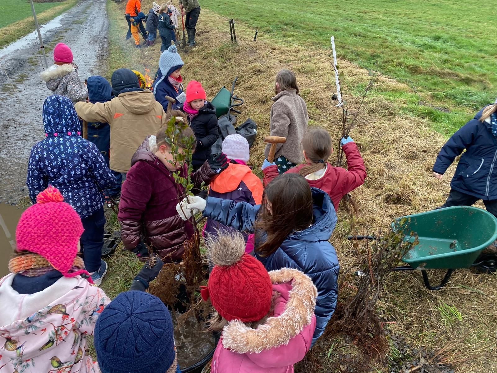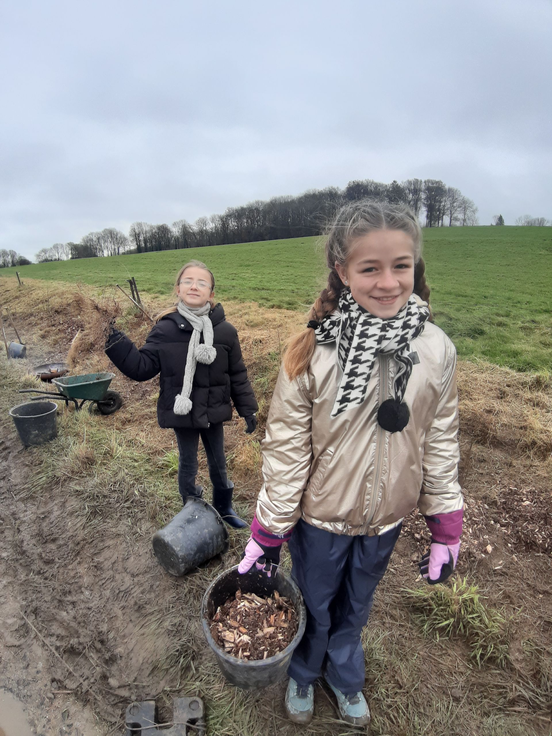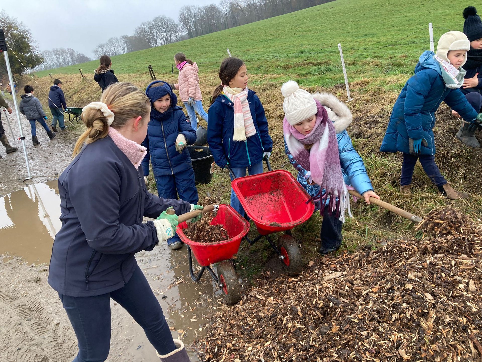 Ce vendredi 28 novembre 2025, les enfants de nos classes primaires ont retroussé leurs manches pour participer à l’opération Haie-Lève, organisée en partenariat avec le Parc naturel « Cœur du Condroz ». Aux côtés de Pierre André, dit « Pelo », véritable pilier de ce projet plusieurs années, les enfants ont poursuivi la plantation des arbustes qui finiront un jour à créer une haie vivante reliant le village de Sorée à la Bouchaille.
