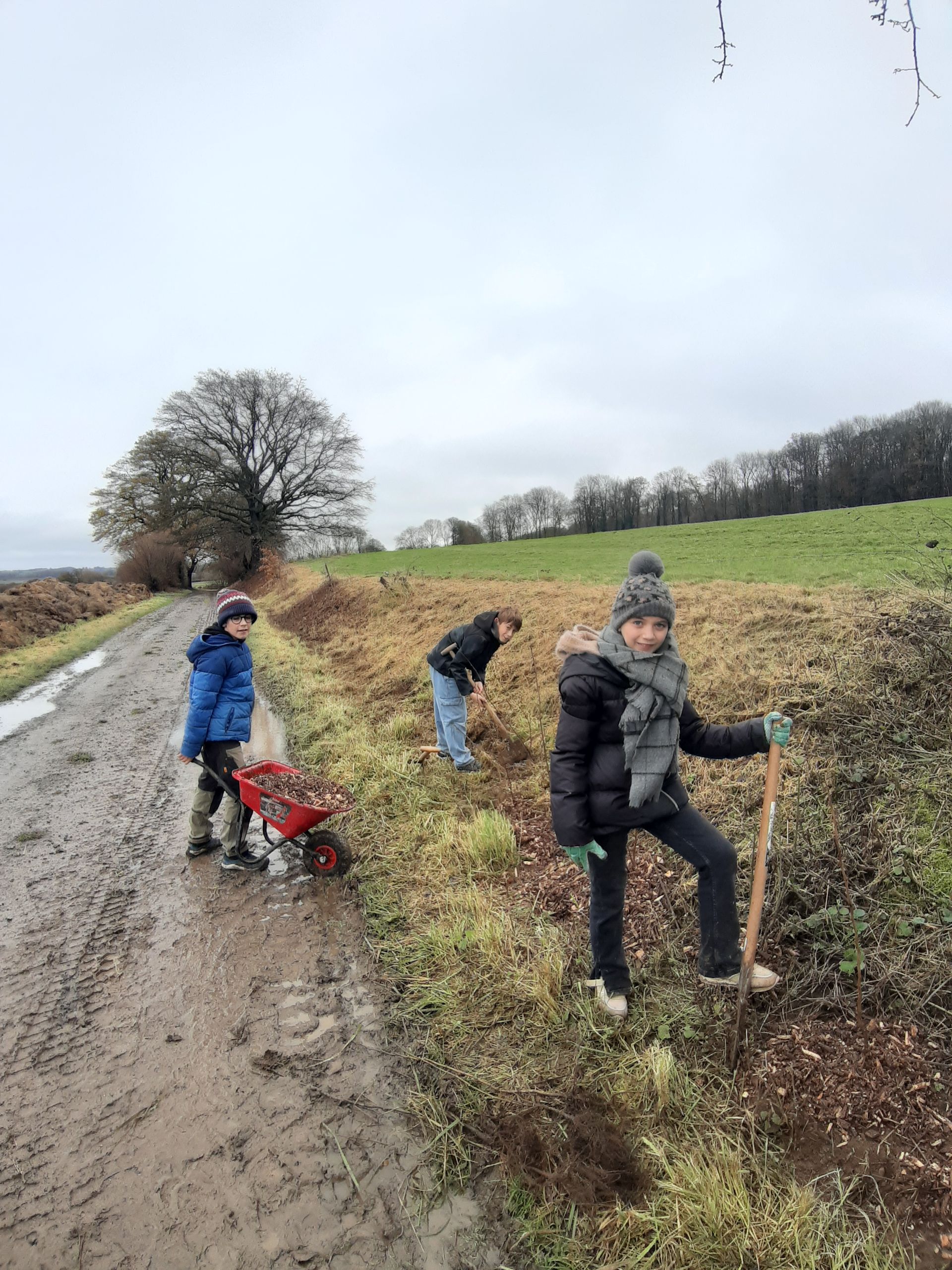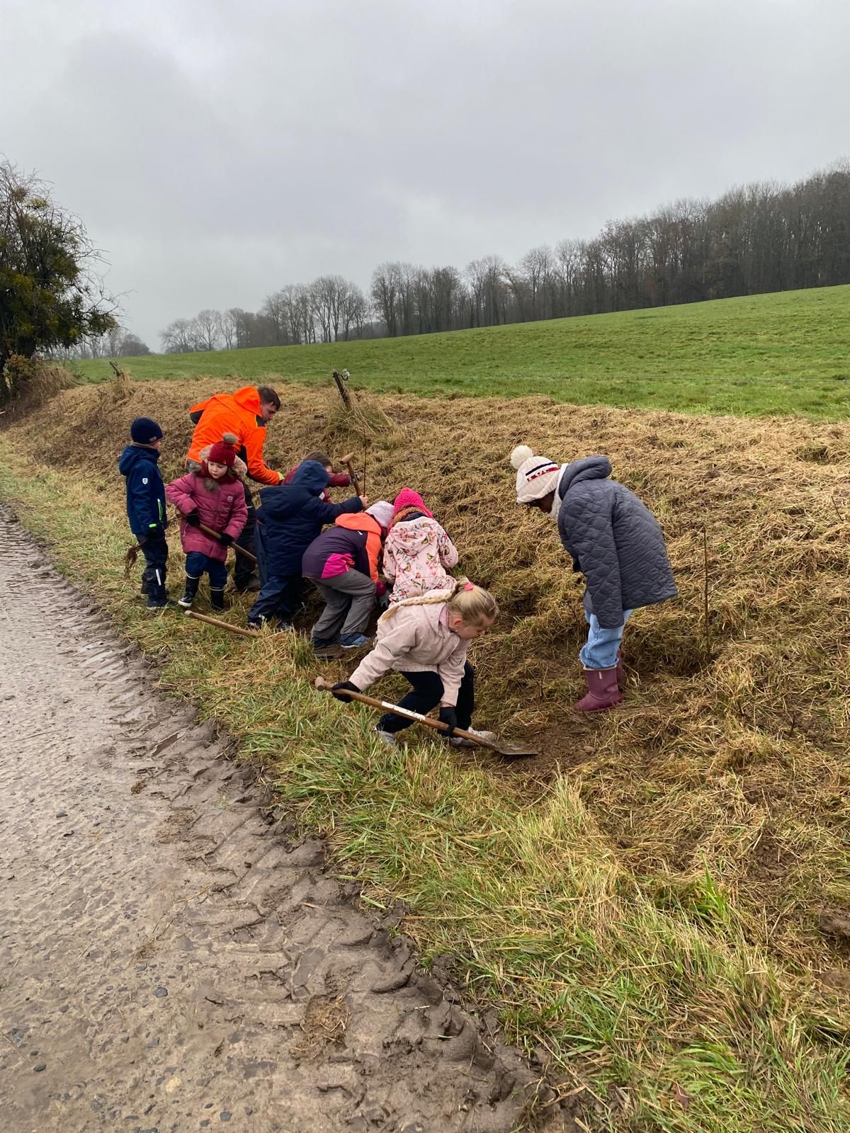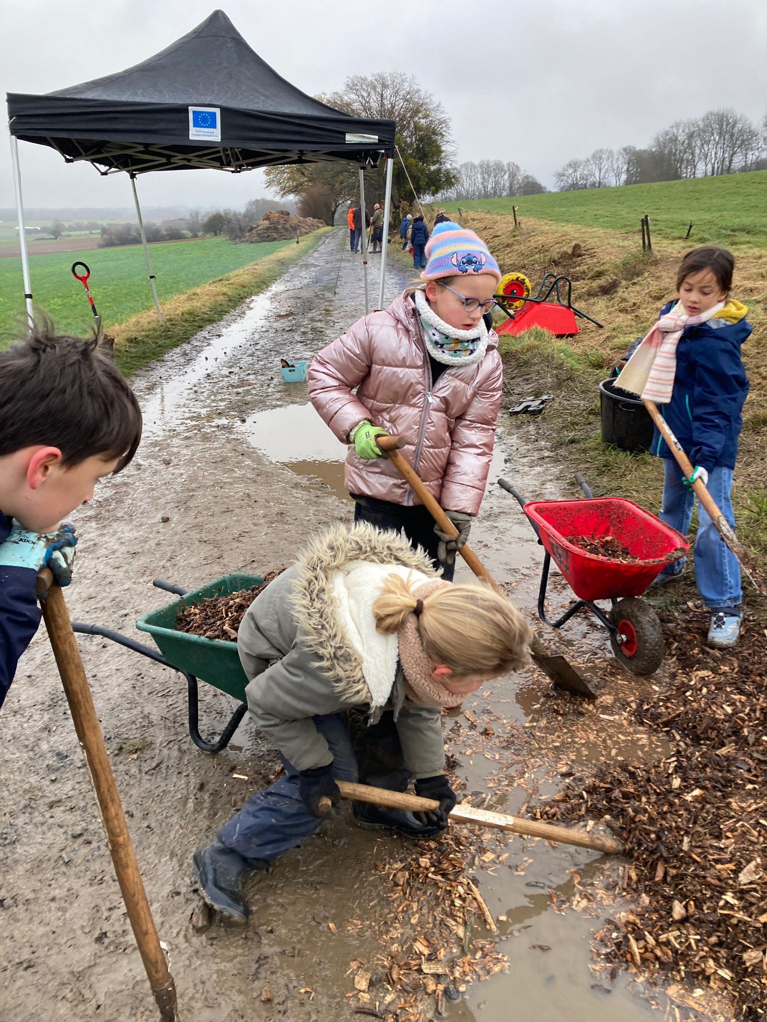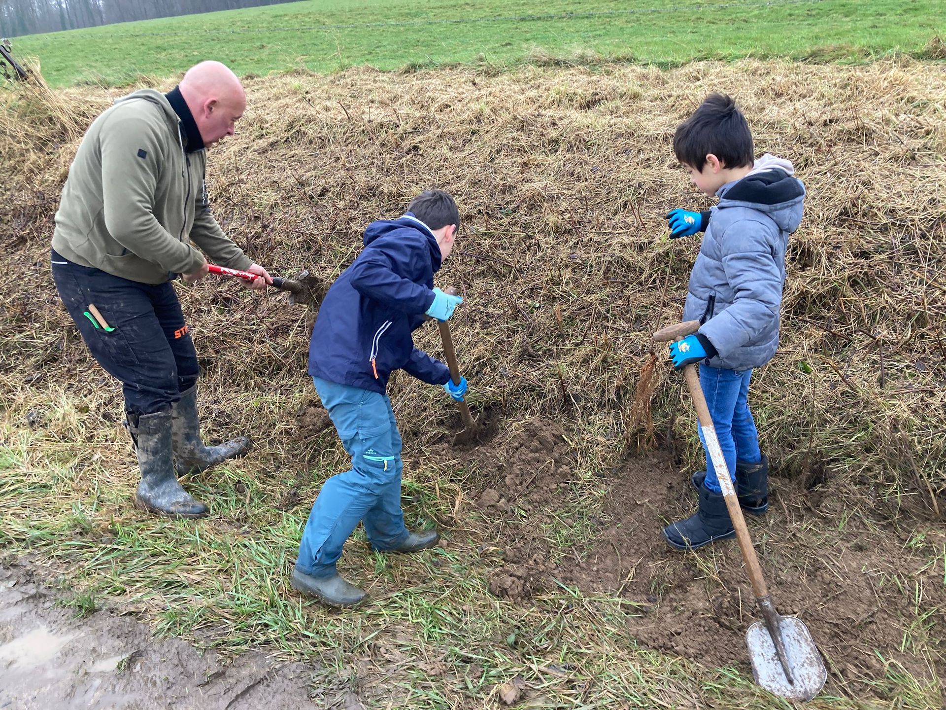 Ce vendredi 28 novembre 2025, les enfants de nos classes primaires ont retroussé leurs manches pour participer à l’opération Haie-Lève, organisée en partenariat avec le Parc naturel « Cœur du Condroz ». Aux côtés de Pierre André, dit « Pelo », véritable pilier de ce projet plusieurs années, les enfants ont poursuivi la plantation des arbustes qui finiront un jour à créer une haie vivante reliant le village de Sorée à la Bouchaille.