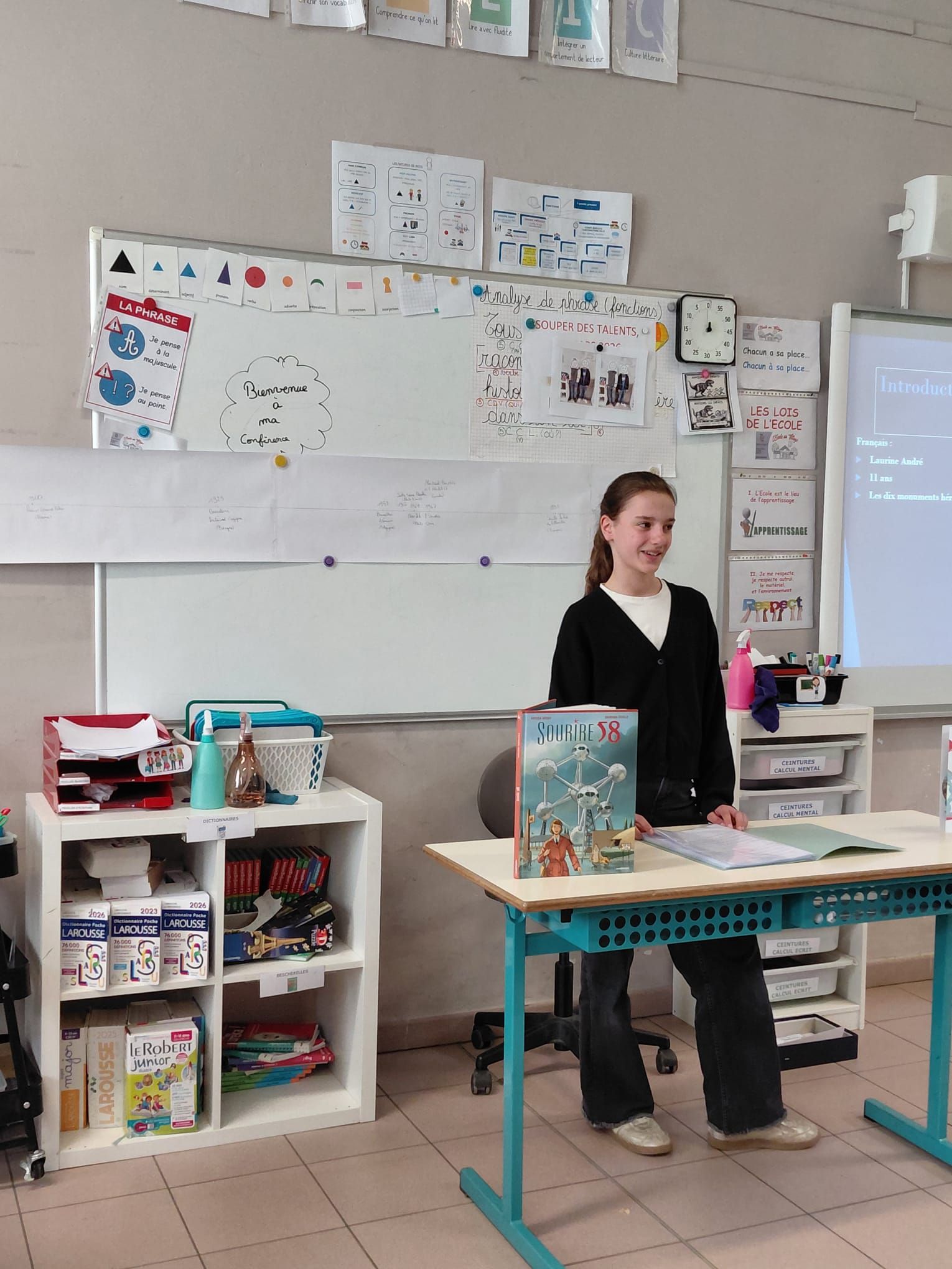 Ce lundi 13 avril 2026, Laurine a ouvert avec brio la session des conférences de nos élèves de P6. Cette présentation s’inscrit dans le cadre du Chef‑d’œuvre pédagogique, un dispositif qui invite chaque élève à concevoir, développer et présenter un projet personnel de longue haleine. Il s’agit d’un véritable parcours d’apprentissage : choisir un sujet qui le passionne, mener des recherches, organiser ses idées, créer des supports, puis partager le fruit de son travail devant un public. Le Chef‑d’œuvre valorise l’autonomie, la persévérance, la créativité et la capacité à communiquer clairement.