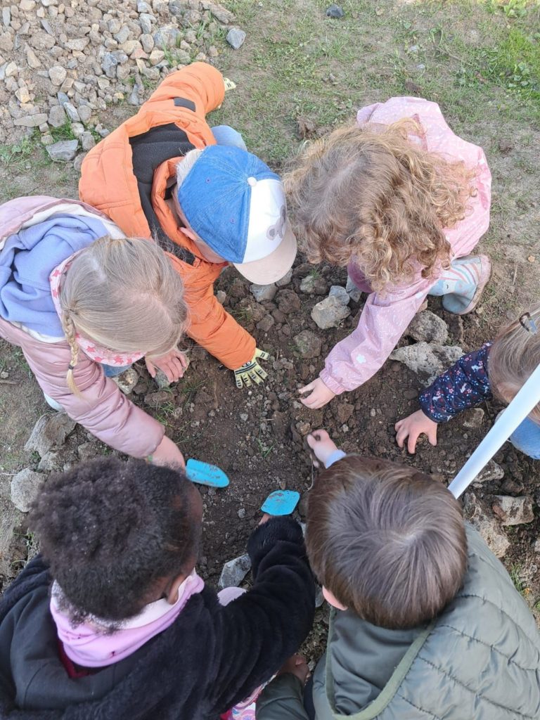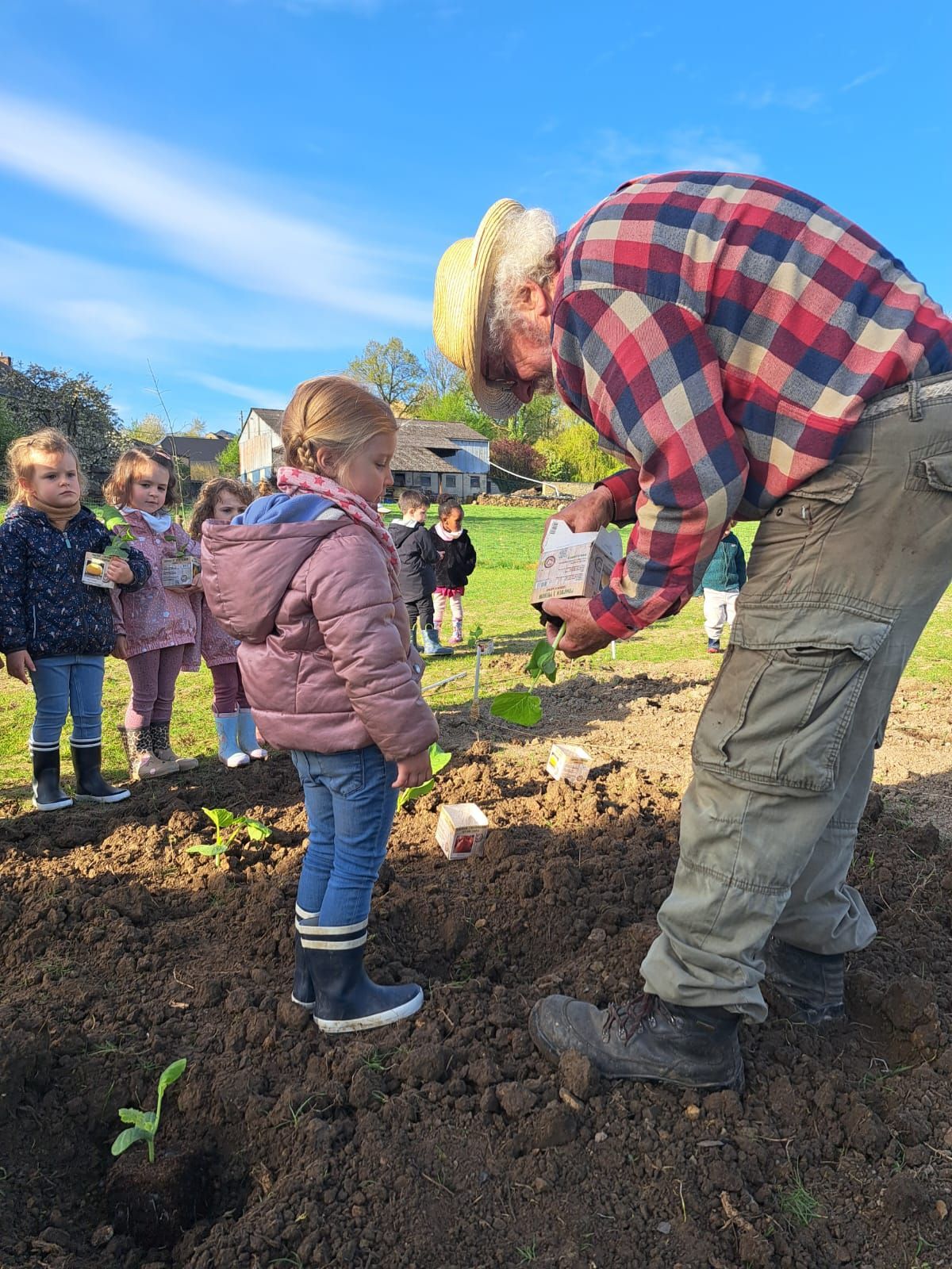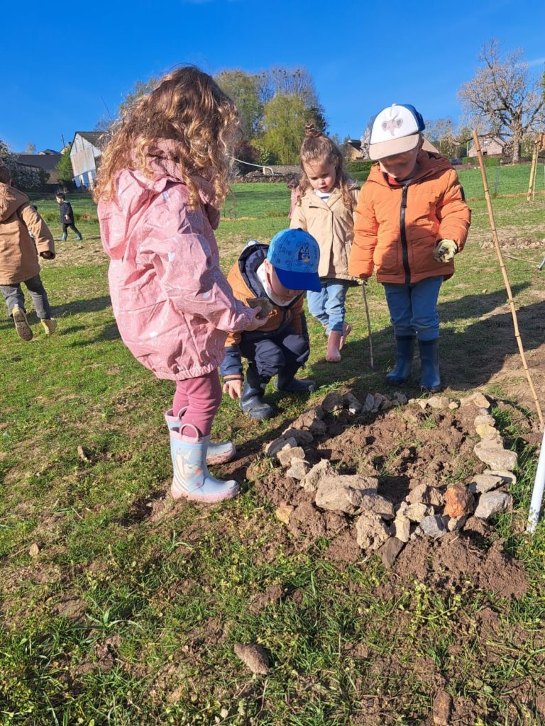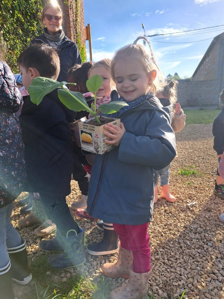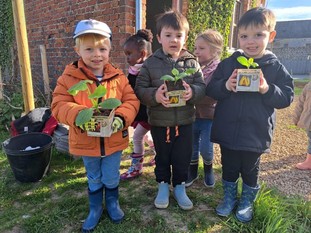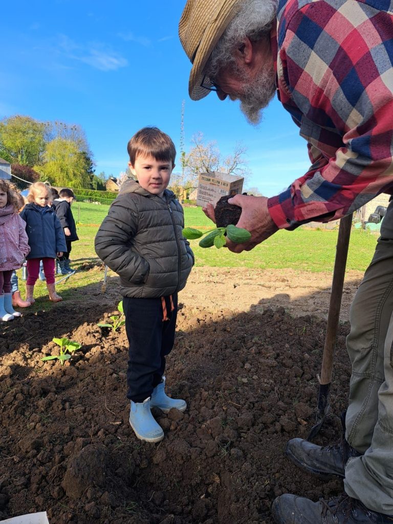 De leur côté, les petits de la classe de Delphine et de Marie‑Pierre se sont rendus au potager de l’Espace Nature. Accompagnés de l’incontournable Papy Chapeau, ils ont poursuivi leurs plantations : manipulation de la terre, découverte des outils, soin apporté aux jeunes pousses… un moment privilégié pour comprendre, par l’expérience, comment grandissent les plantes.