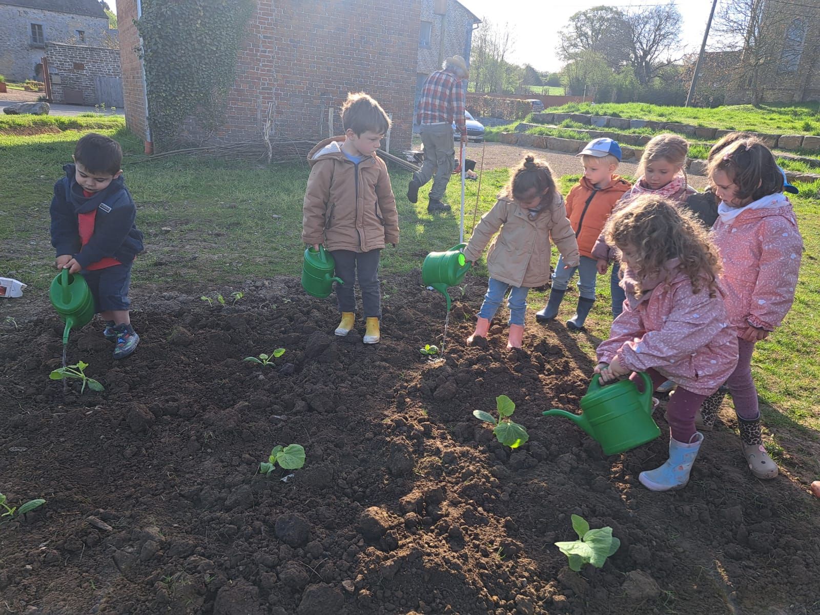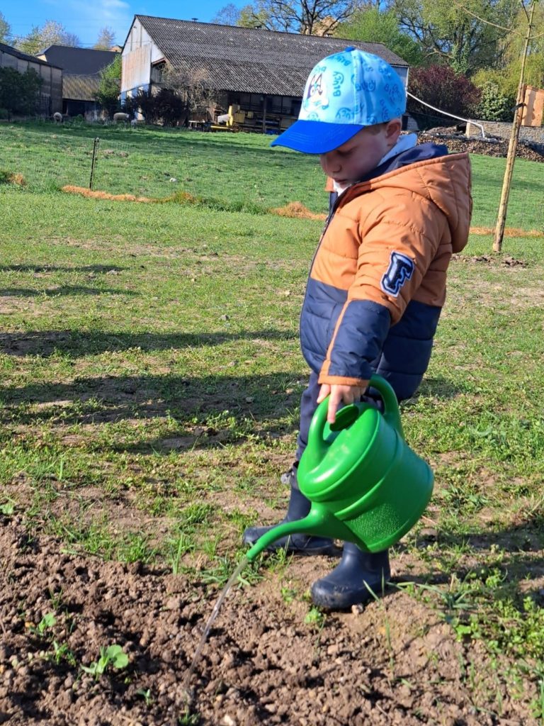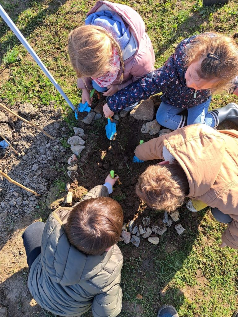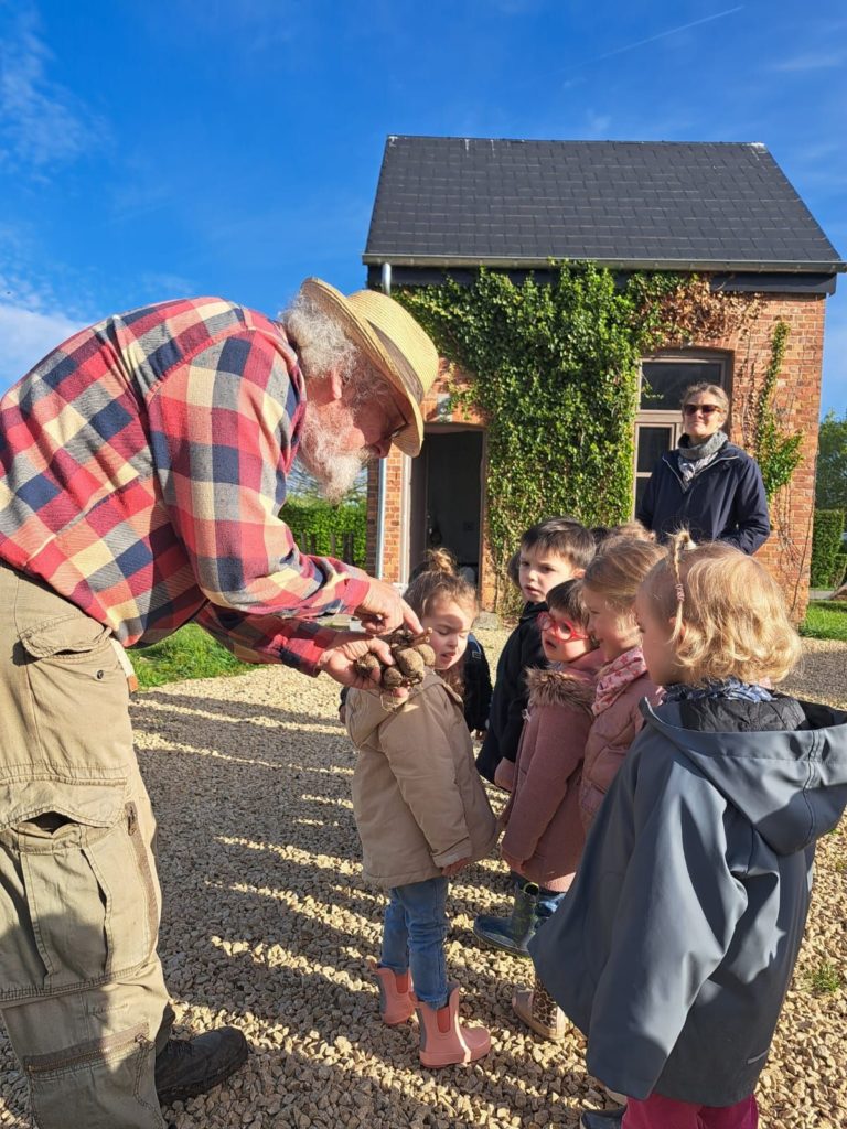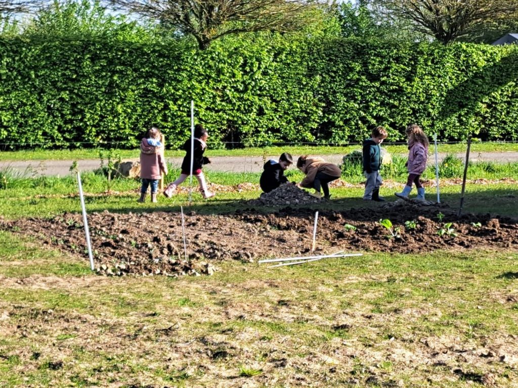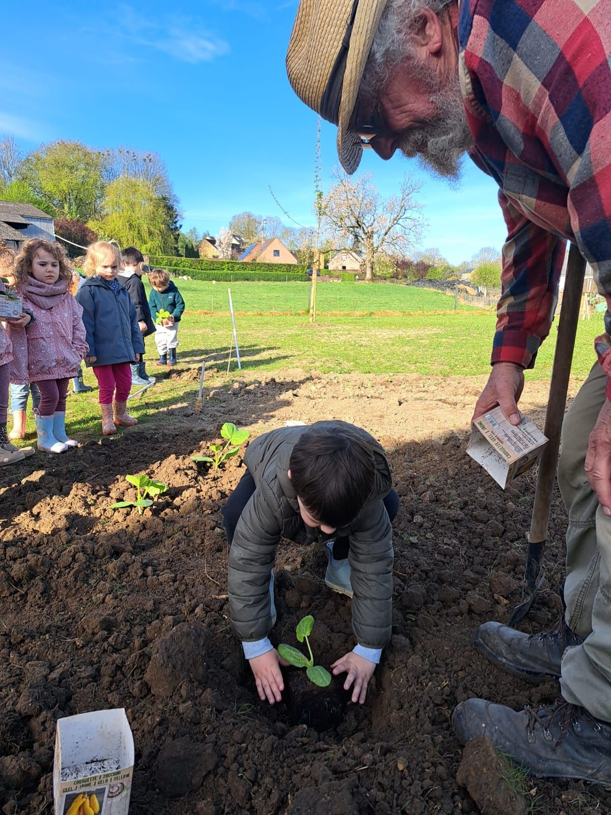 De leur côté, les petits de la classe de Delphine et de Marie‑Pierre se sont rendus au potager de l’Espace Nature. Accompagnés de l’incontournable Papy Chapeau, ils ont poursuivi leurs plantations : manipulation de la terre, découverte des outils, soin apporté aux jeunes pousses… un moment privilégié pour comprendre, par l’expérience, comment grandissent les plantes.