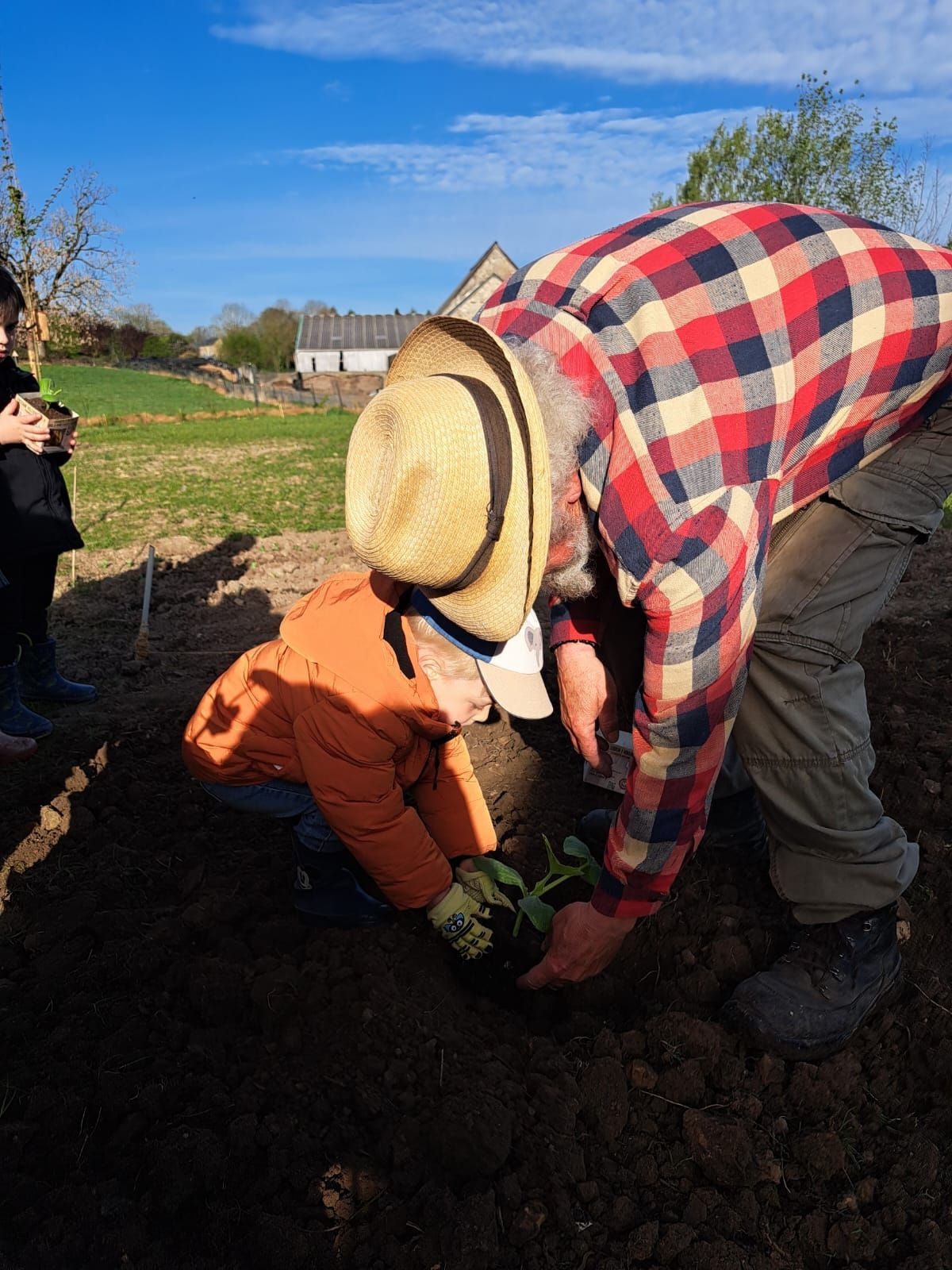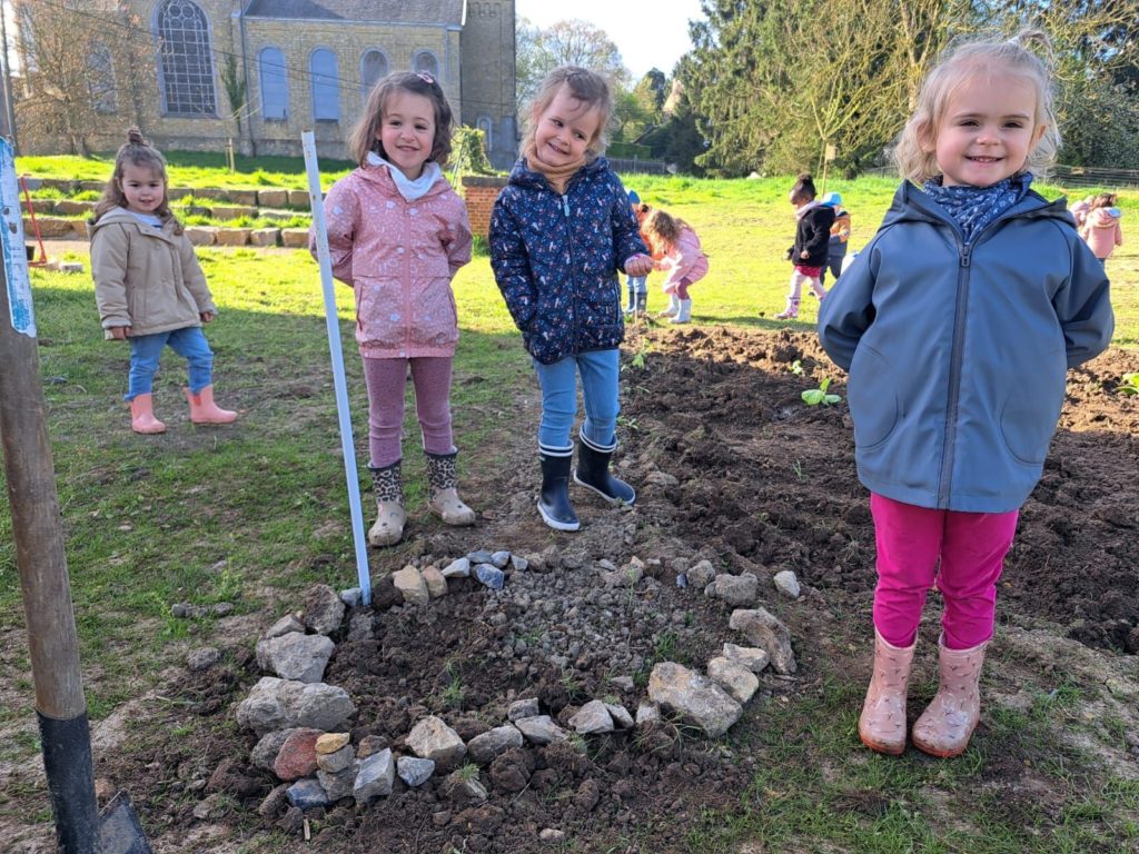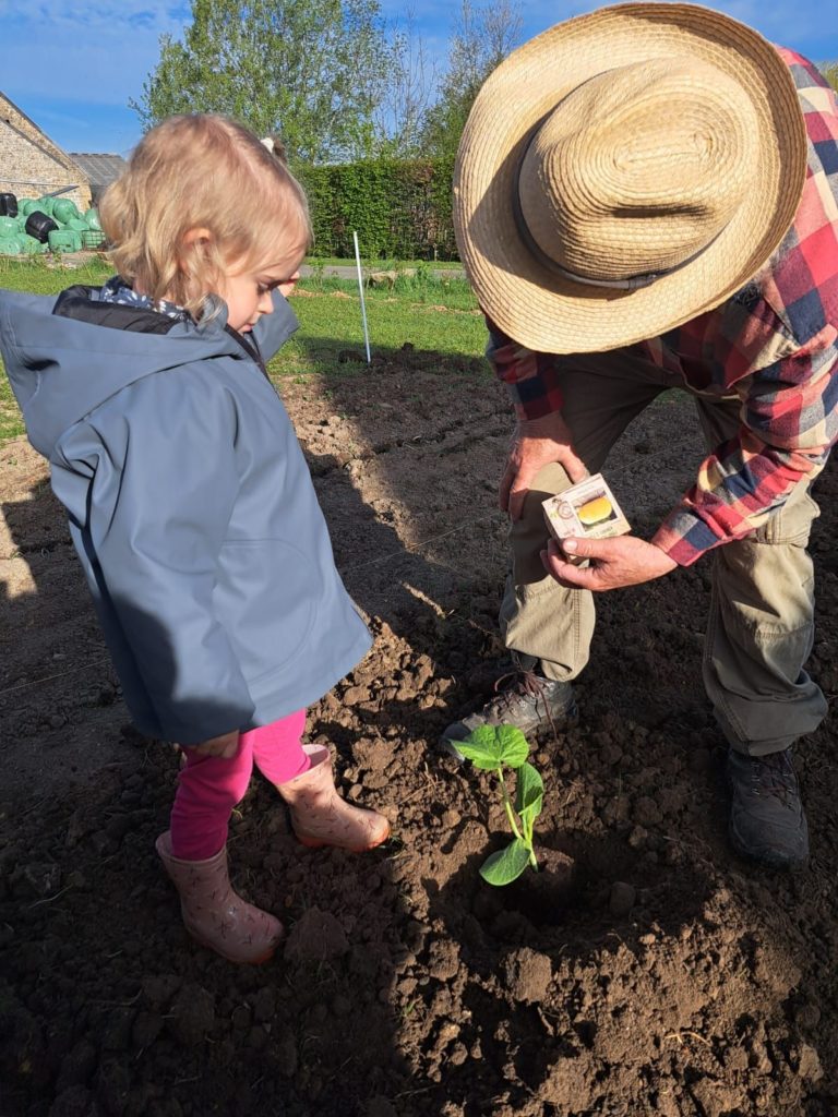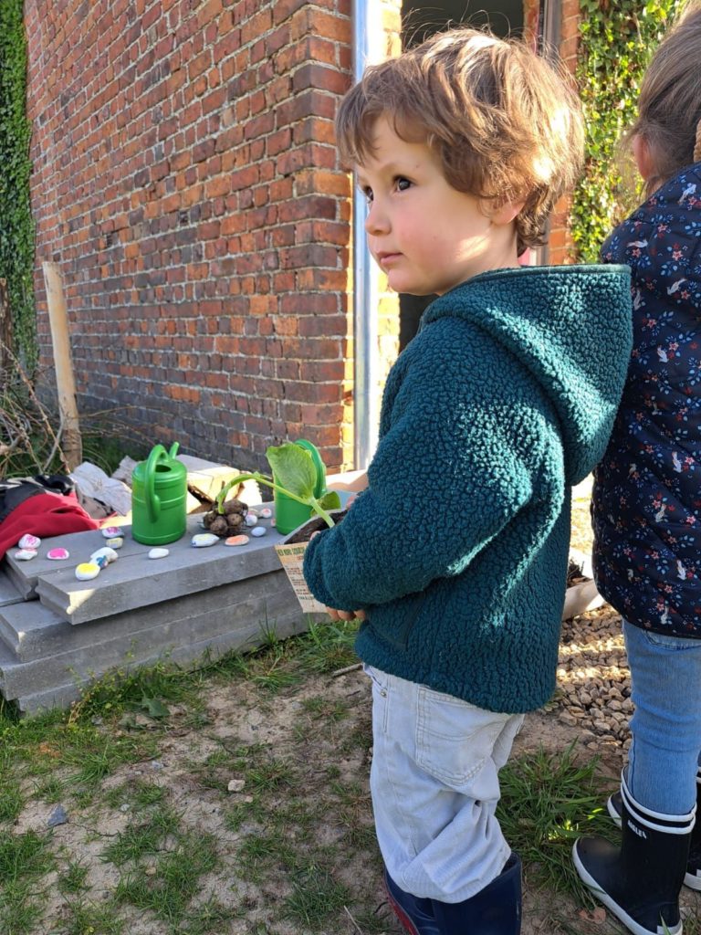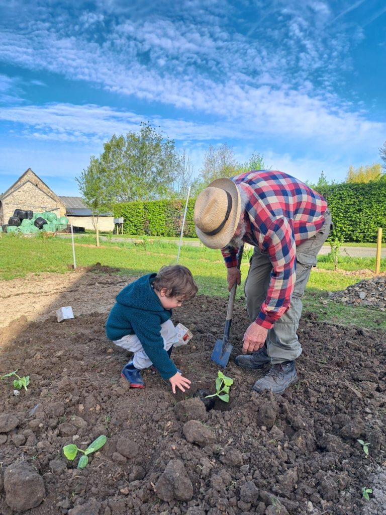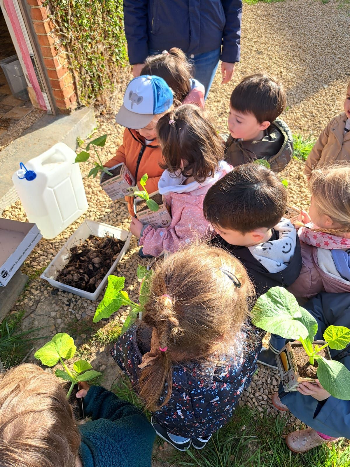 De leur côté, les petits de la classe de Delphine et de Marie‑Pierre se sont rendus au potager de l’Espace Nature. Accompagnés de l’incontournable Papy Chapeau, ils ont poursuivi leurs plantations : manipulation de la terre, découverte des outils, soin apporté aux jeunes pousses… un moment privilégié pour comprendre, par l’expérience, comment grandissent les plantes.