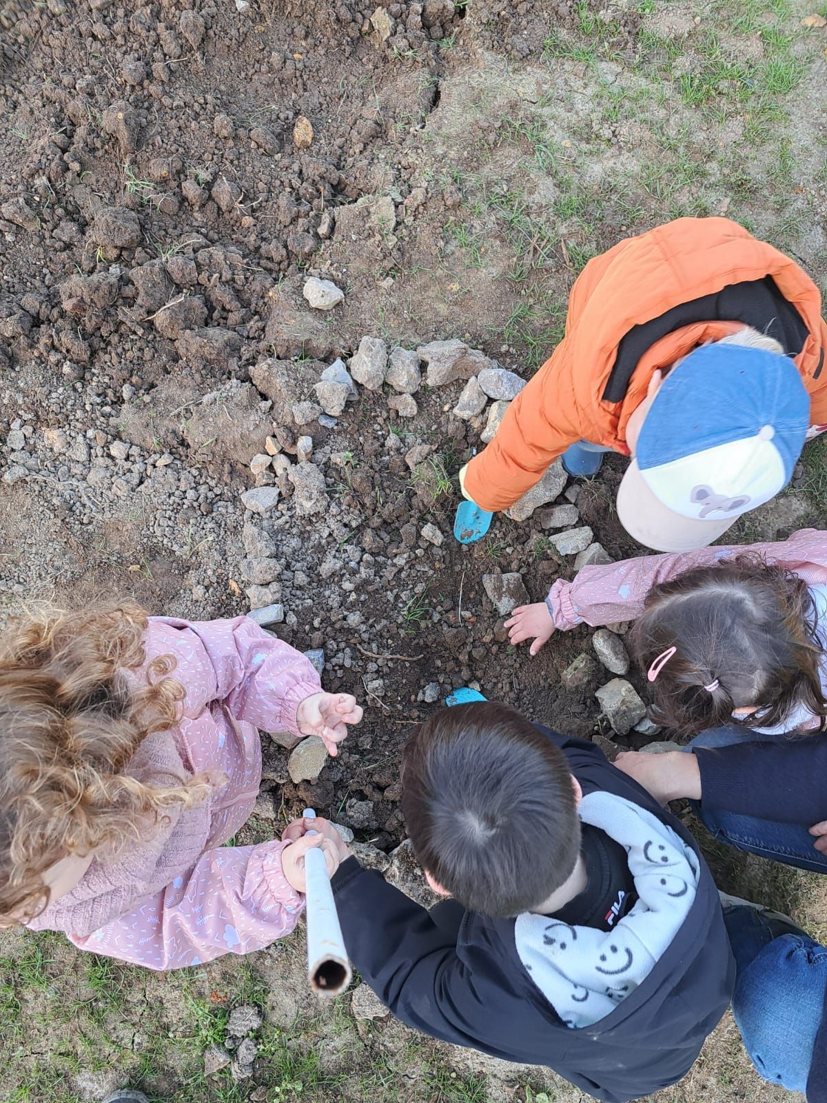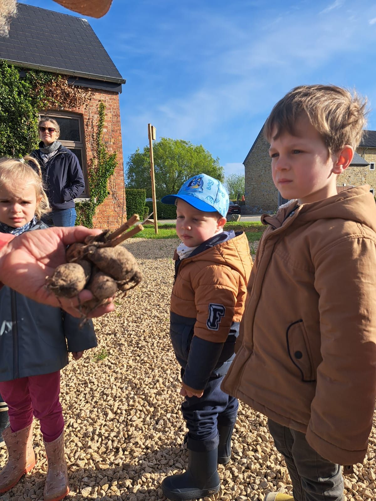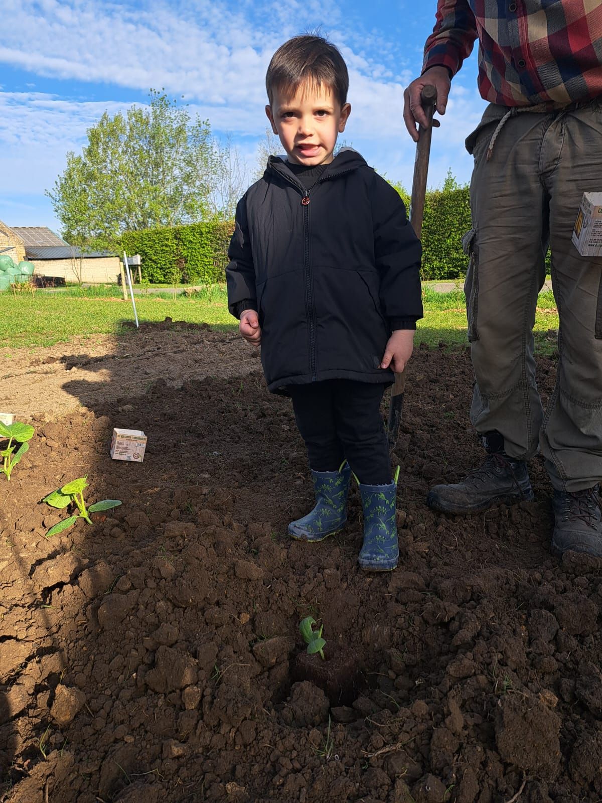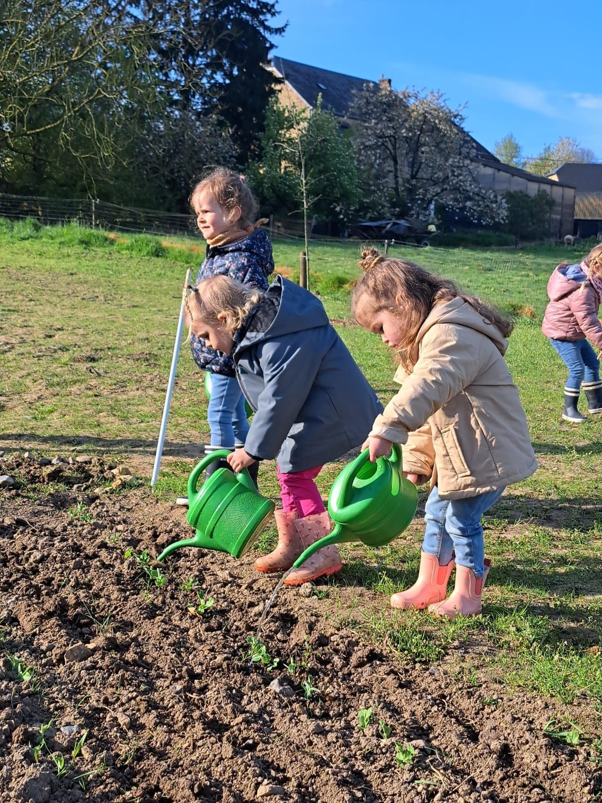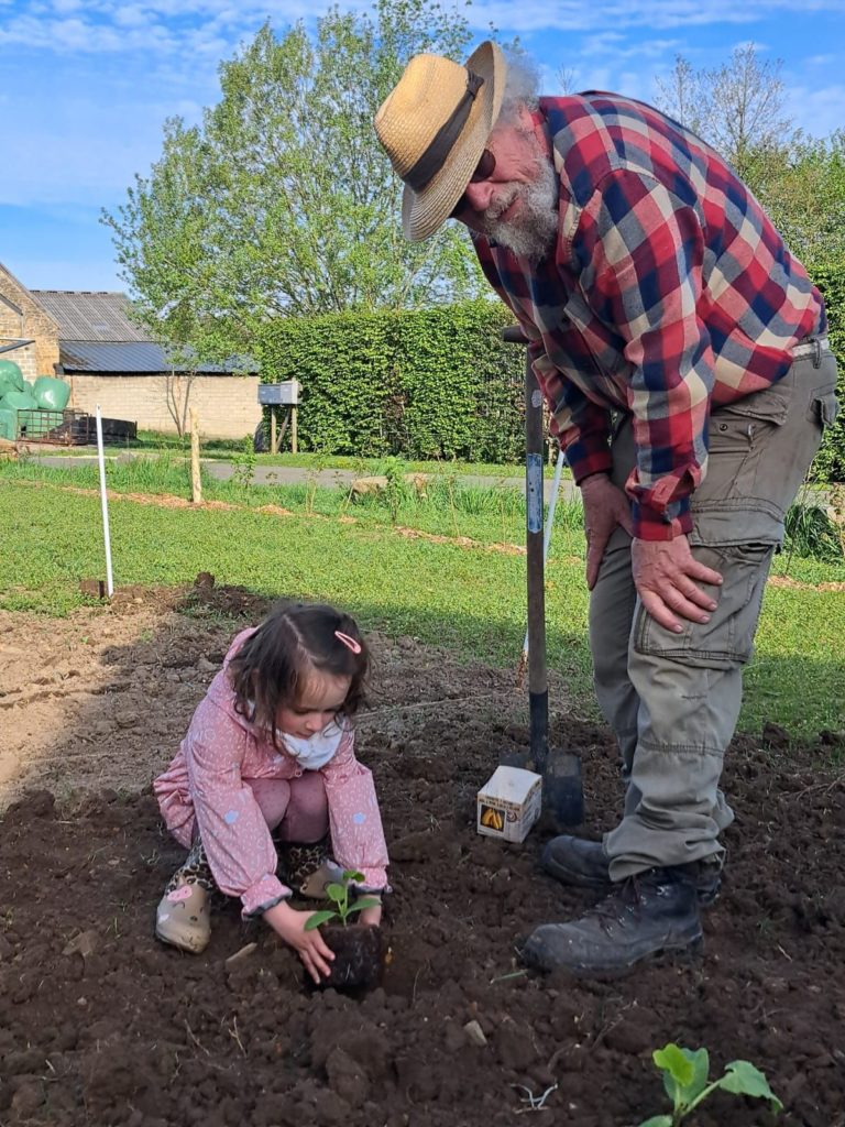 De leur côté, les petits de la classe de Delphine et de Marie‑Pierre se sont rendus au potager de l’Espace Nature. Accompagnés de l’incontournable Papy Chapeau, ils ont poursuivi leurs plantations : manipulation de la terre, découverte des outils, soin apporté aux jeunes pousses… un moment privilégié pour comprendre, par l’expérience, comment grandissent les plantes.
